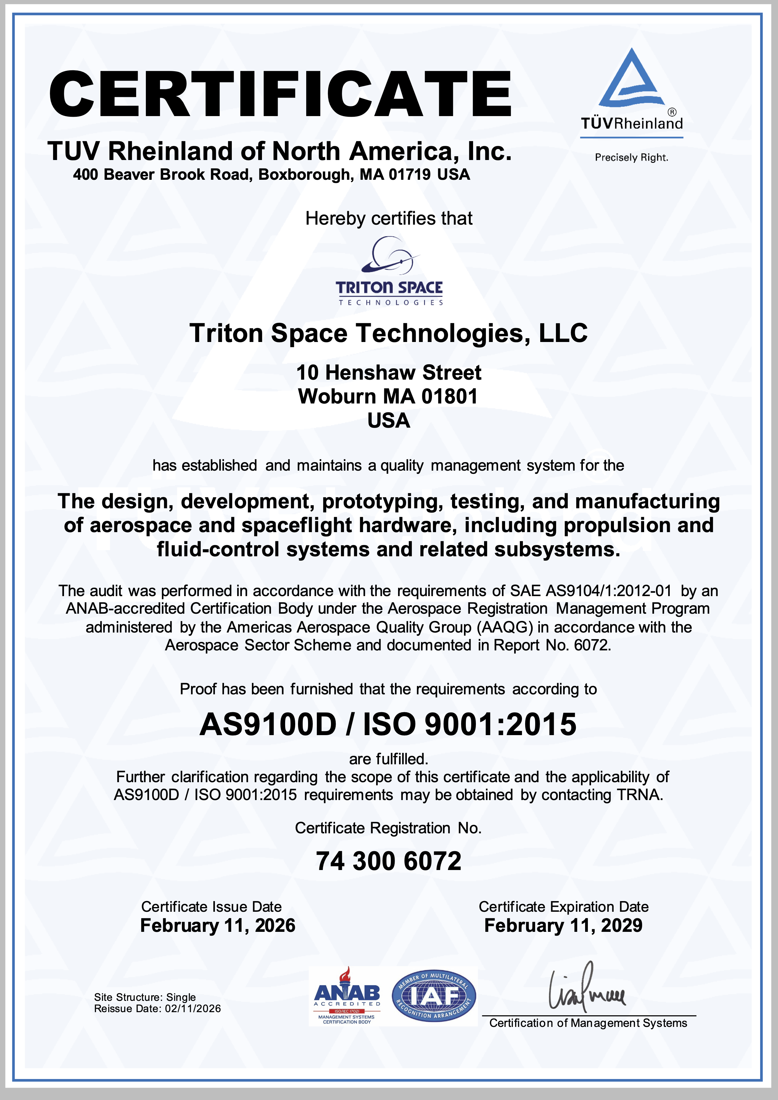 Triton Space Technologies is AS9100D / ISO 9001:2015 certified with TÜV Rheinland of North America.
