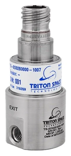 The TS-SD02B3000-1007 from Triton Space Technologies is a simple, compact, lightweight, in-line, direct-acting, miniature 3-way solenoid valve. This valve is designed specifically as a piloting-valve for service in high-pressure applications for pneumatic systems where venting the actuation gas pressure overboard to atmosphere is acceptable. Use of a polished ceramic ball and polyamide-imide polymer seat afford low leakage and high service life. The TS-SD02B3000-1007 is purpose built for 21st century spaceflight applications. Contact us today for more information or to place your order.